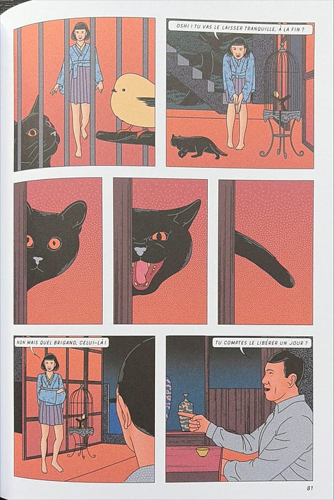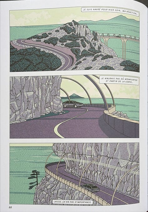 Le scénario imaginé par Baptiste Chaubard nous plonge dans plusieurs thèmes : la relation d’un couple qui tente de raviver sa flamme, la tension entre traditions et modernité, les relations entre humains et humanoïdes, et bien d’autres encore. Il y a peu de dialogues (il faut attendre la page 38 pour lire le premier mot). La BD est conçue pour laisser vos pensées vagabonder sur ces questions.