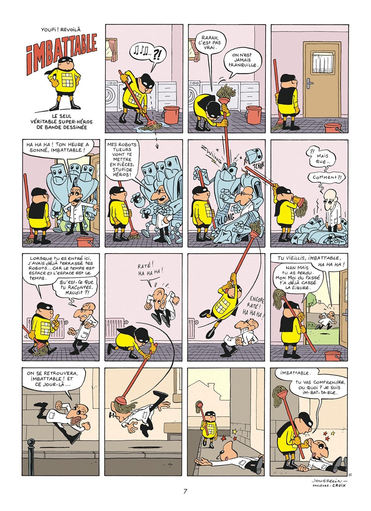 Pascal Jousselin joue avec les cases et une créativité sans limites. Imbattable (Mister Invicible dans la version américaine que j’ai lue) se sort de toutes les situations en utilisant toutes les cases de chaque planche. Découvrir