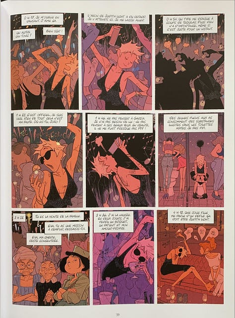 L’action est menée tambour battant et ménage son lot de surprises. J’ai en revanche moins accroché à la storyline qui se déroule chez son psychiatre, où Eva raconte son histoire, entrecoupée des interventions de ce dernier qui tente de la recadrer et de la présence un peu trop pesante des voix de ses trois ancêtres. La construction ne laisse pas assez de place au développement des personnages secondaires. L’héroïne perd aussi un peu des ambiguïtés qui faisaient son charme pour devenir plus prévisible. Le dessin expressif colle toujours parfaitement à l’action et aux personnages, dynamique et superbement coloré.