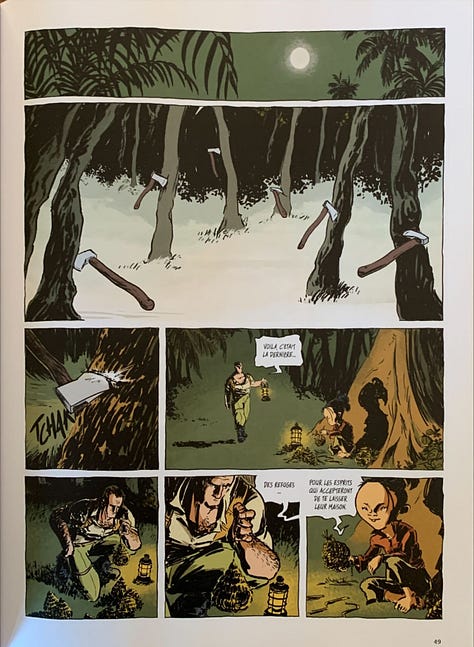 Inspirés par le grand-père de Renaud Farace, lui-même bûcheron et grand taiseux, Amaya Alsumard et Renaud Farace ont conçu un album-fleuve de 220 pages, qui se lit comme un conte sur l’Indochine coloniale et la confrontation entre colons et autochtones. L’œuvre est magnifiquement illustrée par les dessins de Renaud Farace et les couleurs de Drac. Découvrir
